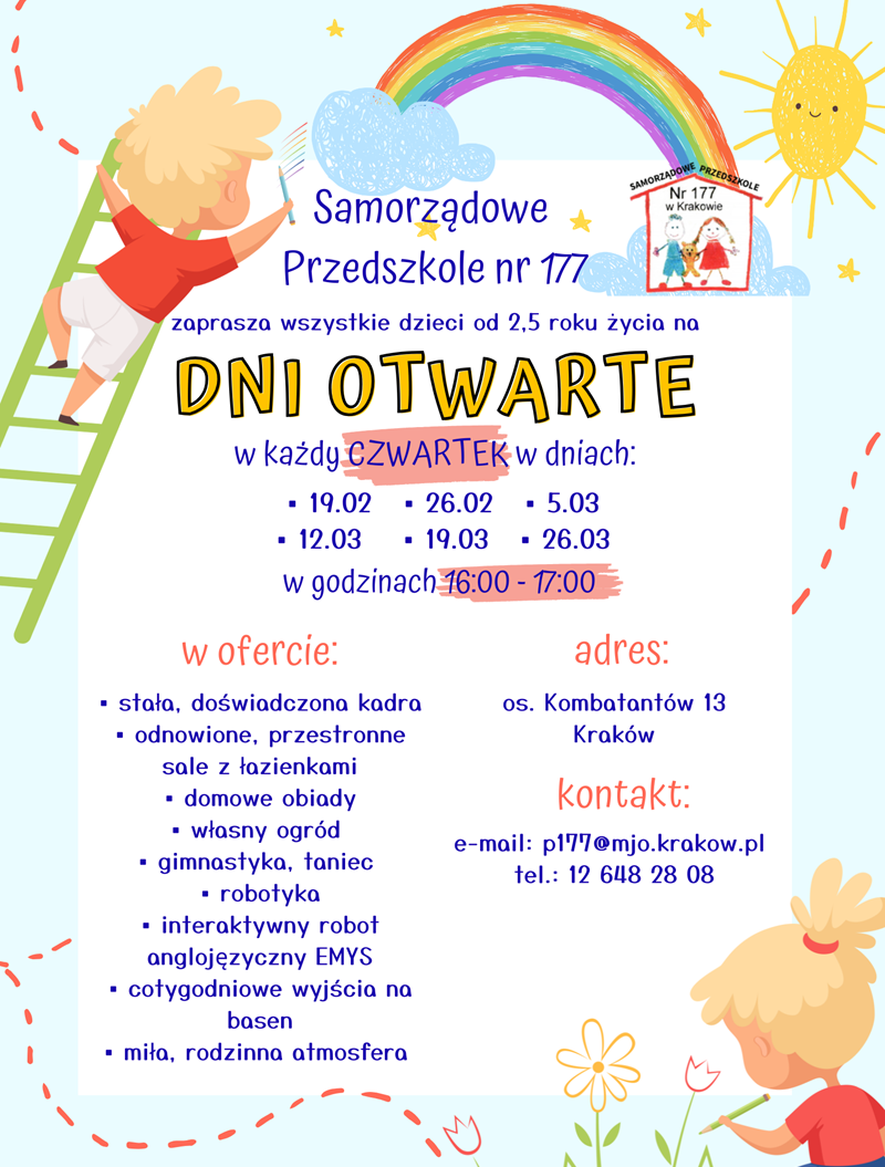 Dyrektor Samorządowego Przedszkola nr 177 informuje, iż przedszkole pełni dyżur wakacyjny w miesiącu lipcu. O terminie zapisu na dyżur poinformujemy Państwa w późniejszym terminie.